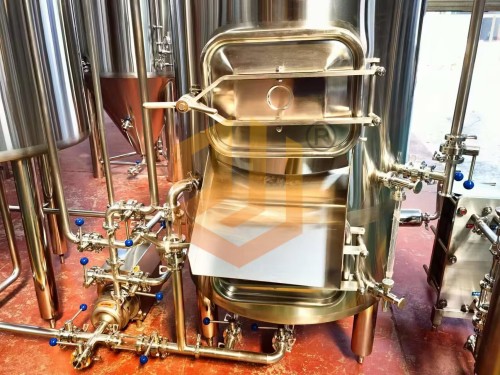精釀啤酒設(shè)備使用的過濾槽與旋沉罐:采用上下兩層的設(shè)計方式,整體占地面積小,過濾槽采用銑制篩板,頂部采用異型人孔設(shè)計,側(cè)面配有出糟口,方形人孔門設(shè)計更有利于啤酒麥糟的清理工作,同時還配有出糟板。內(nèi)部配有耕刀裝置,用于疏松麥糟層以及出糟使用。